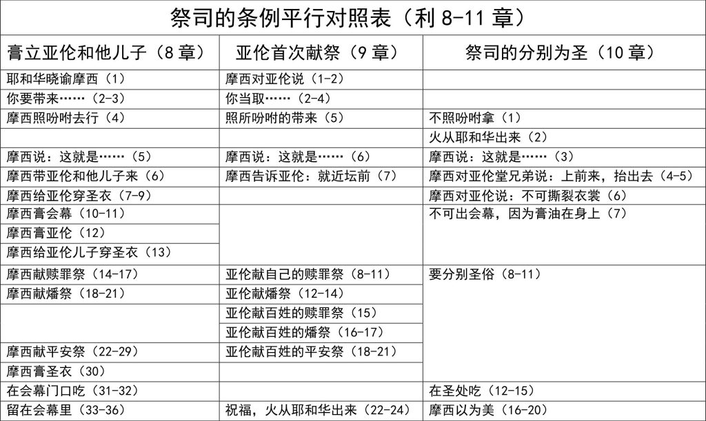 第35天:祭司的条例 分享:韩天晓 |读经:利8-10章 https://www.aidezhendi.site/wp-content/uploads/2025/02/祭司的条例.m4a 膏立亚伦和他儿子(8章) 耶和华晓谕摩西(1) 你要带来……(2-3) 摩西照吩咐去行(4) 摩西说:这就是……(5) 摩西带亚伦和他儿子来(6) 摩西给亚伦穿圣衣(7-9) 摩西膏会幕(10-11) 摩西膏亚伦(12) 摩西给亚伦儿子穿圣衣(13) 摩西献赎罪祭(14-17) 摩西献燔祭(18-21) 摩西献平安祭(22-29) 摩西膏圣衣(30) 在会幕门口吃(31-32) 留在会幕里(33-36)亚伦首次献祭(9章) 摩西对亚伦说(1-2) 你当取……(2-4) 照所吩咐的带来(5) 摩西说:这就是……(6) 摩西告诉亚伦:就近坛前(7) 亚伦献自己的赎罪祭(8-11) 亚伦献燔祭(12-14) 亚伦献百姓的赎罪祭(15) 亚伦献百姓的燔祭(16-17) 亚伦献百姓的平安祭(18-21) 祝福,火从耶和华出来(22-24)祭司的分别为圣(10章) 不照吩咐拿(1) 火从耶和华出来(2) 摩西说:这就是……(3) 摩西对亚伦堂兄弟说:上前来,抬出去(4-5) 摩西对亚伦说:不可撕裂衣裳(6) 不可出会幕,因为膏油在身上(7) 要分别圣俗(8-11) 在圣处吃(12-15) 摩西以为美(16-20) 喜欢作者,谢谢您的爱心 ▼ 您可以点击以下标签,查看更多的栏目专辑 每日读经 加微信防失联 首页